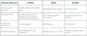 - Selling due to posting – A forced move may require selling earlier than planned, with HPSEA helping offset approved selling costs